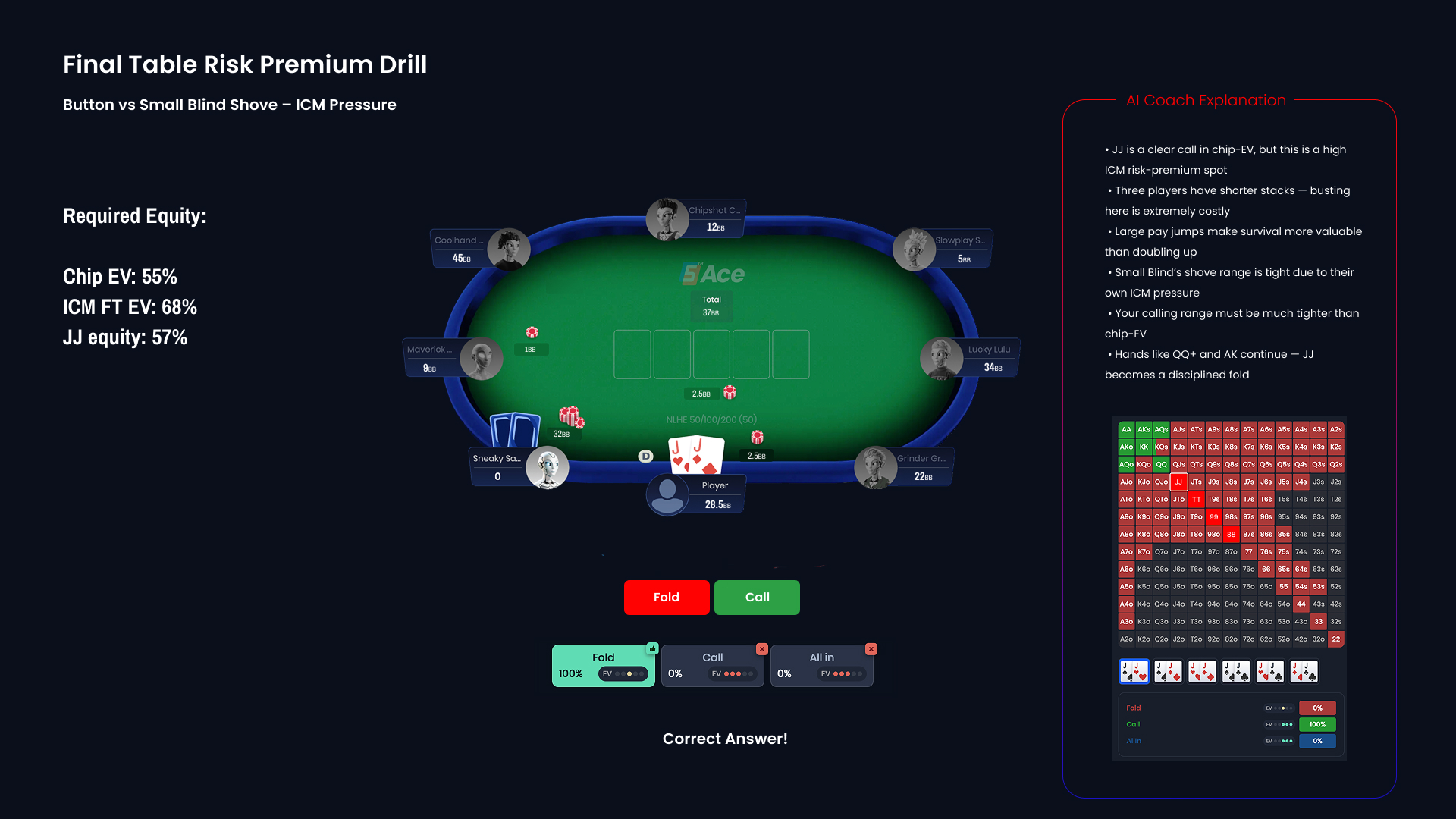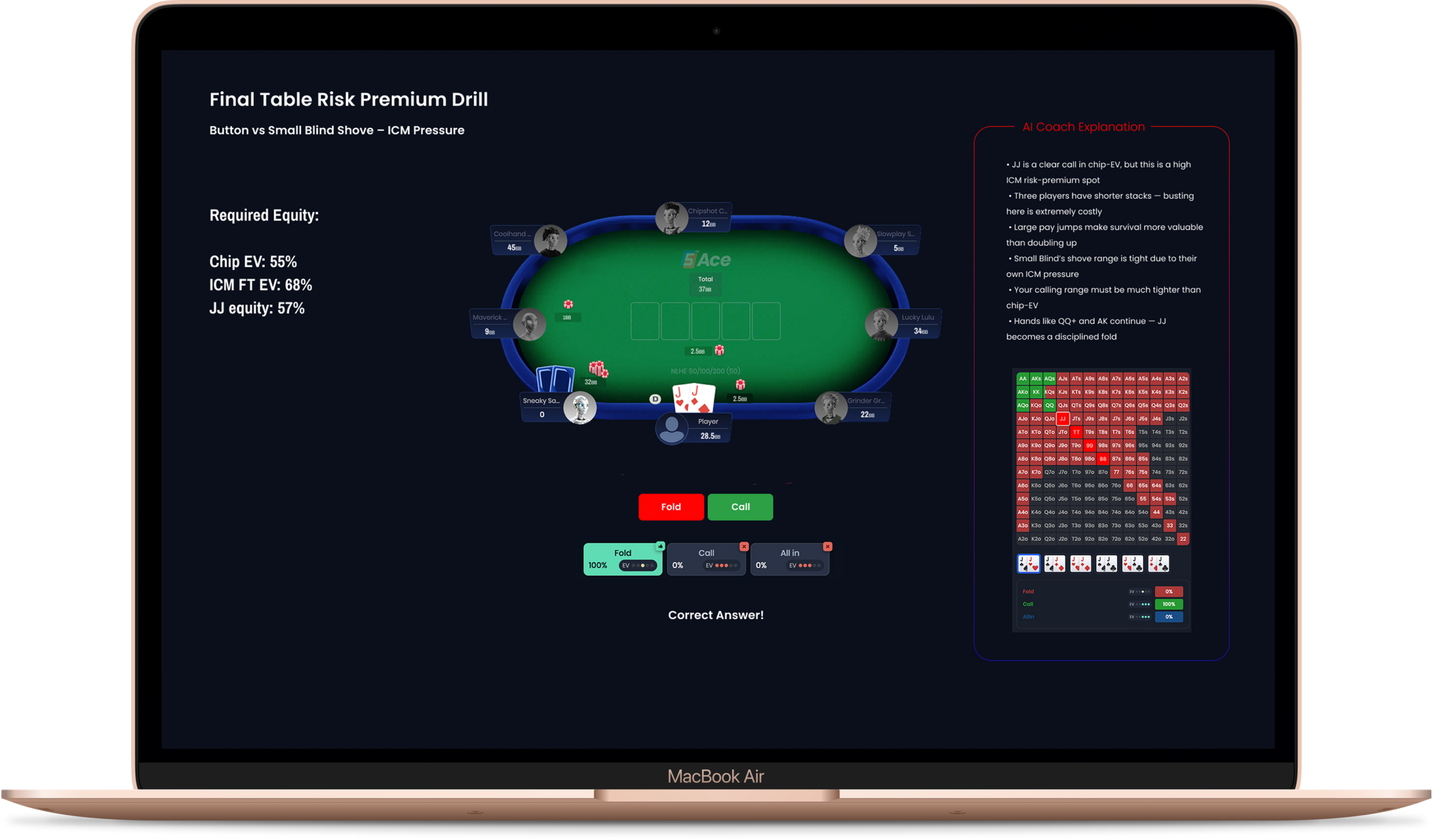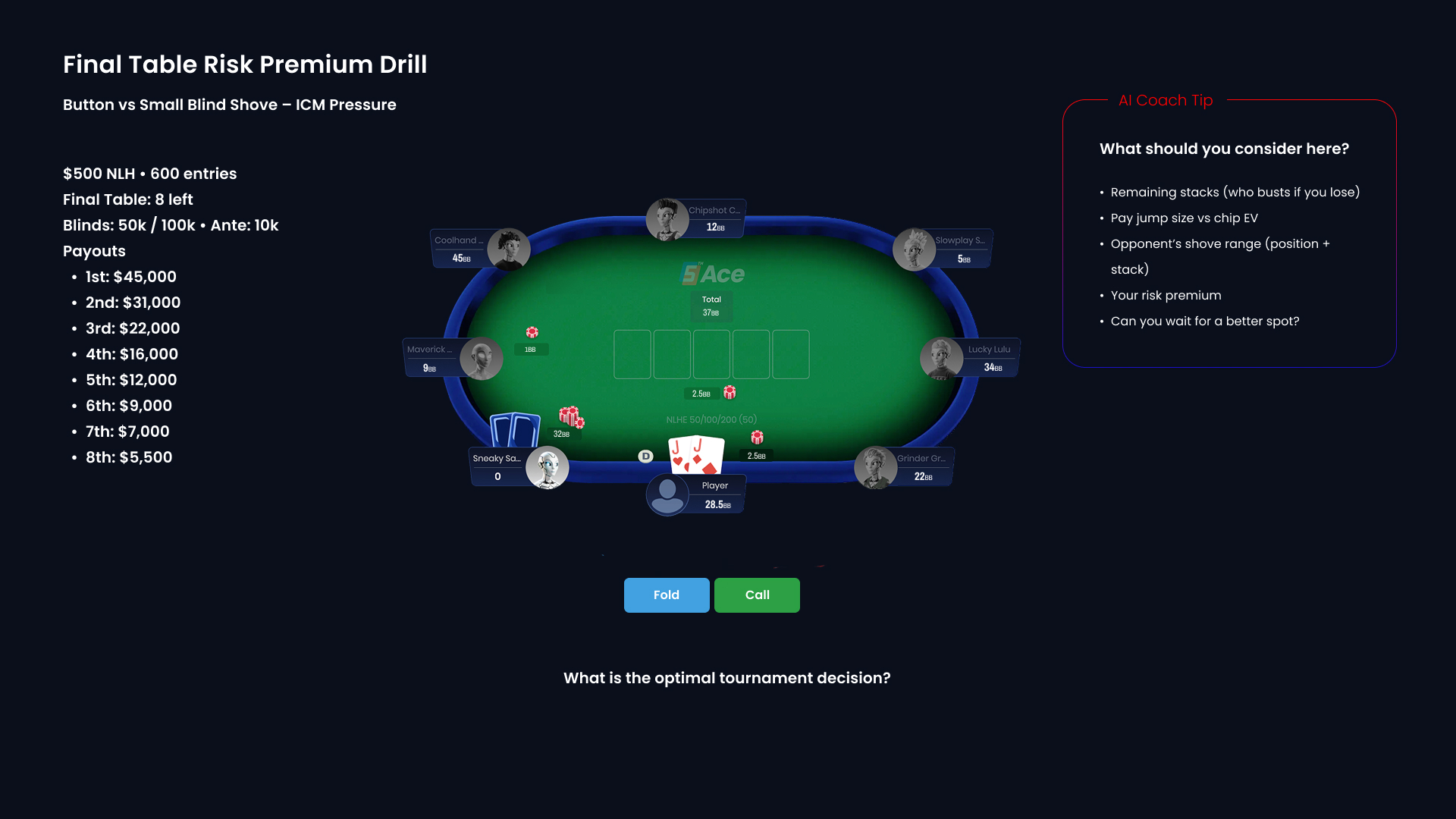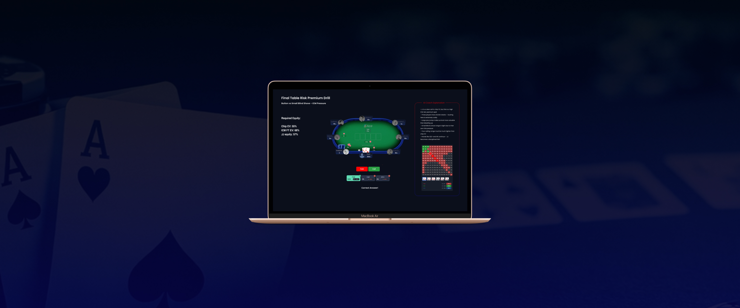 QuintAce is a poker training platform designed to improve decision-making through AI-driven insights. This concept focuses on translating complex game theory and solver outputs into a clear, structured training experience. The goal is to help players understand decisions, build confidence under pressure, and apply theory in real scenarios.